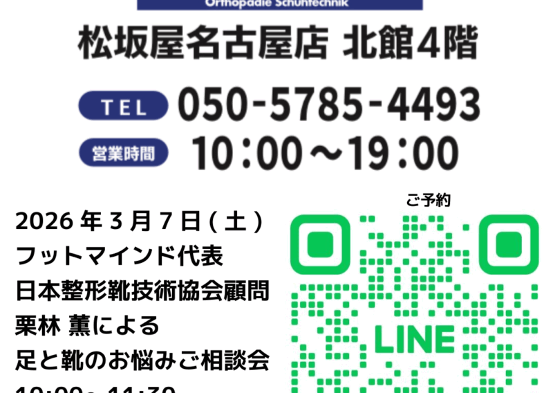 この度、フットマインド松坂屋名古屋店は 2026年3月5日(木)、北館4Fへリニューアルオープンいたします。 日頃のご愛顧への感謝とリニューアルを記念し、 専門家による「足と靴のお悩み相談会」を開催いたします。 ・足の痛みや違和感が気になる方 ・ご家族に足のお悩みをお持ちの方がいらっしゃる方 ・ゴルフやスポーツを快適に楽しみたい方 ・将来のために今から足のケアを考えたい方 この機会にぜひご相談ください。 当日は、フットマインド代表、日本整形靴技術協会顧問を務める 栗林薫がお一人おひとりの足の状態を丁寧に拝見し、 適切な靴選びのアドバイスや靴と足をより良くマッチさせるためのご提案、 さらに快適な歩行を実現するオーダーインソールのご相談を承ります。 ⸻⸻⸻⸻⸻⸻⸻⸻ 【開催日】 3月7日(土) 【場所】 松坂屋名古屋店 北館4階 フットマインド 【時間】 10:00〜11:30 13:30〜17:00 ※各回1組様/30分 【参加費】 無料 ※完全ご予約制 【ご予約・お問い合わせ】 電話:050-5785-4493 またはLINE二次元コードより ⸻⸻⸻⸻⸻⸻⸻⸻ 足は毎日の暮らしを支える大切な土台です。 ぜひこの機会に、ご予約のうえご来店賜りますよう 心よりお待ち申し上げております。![]()